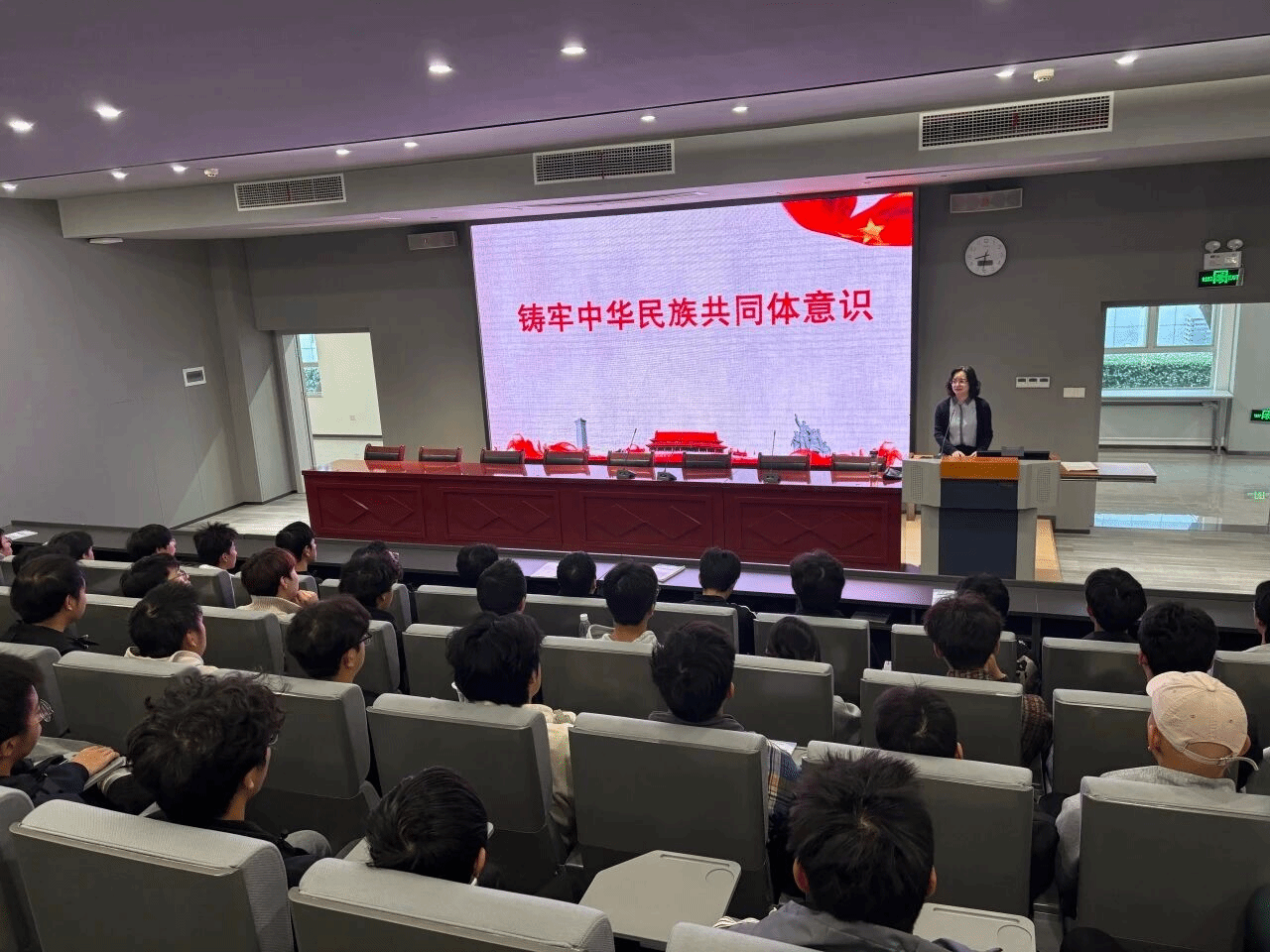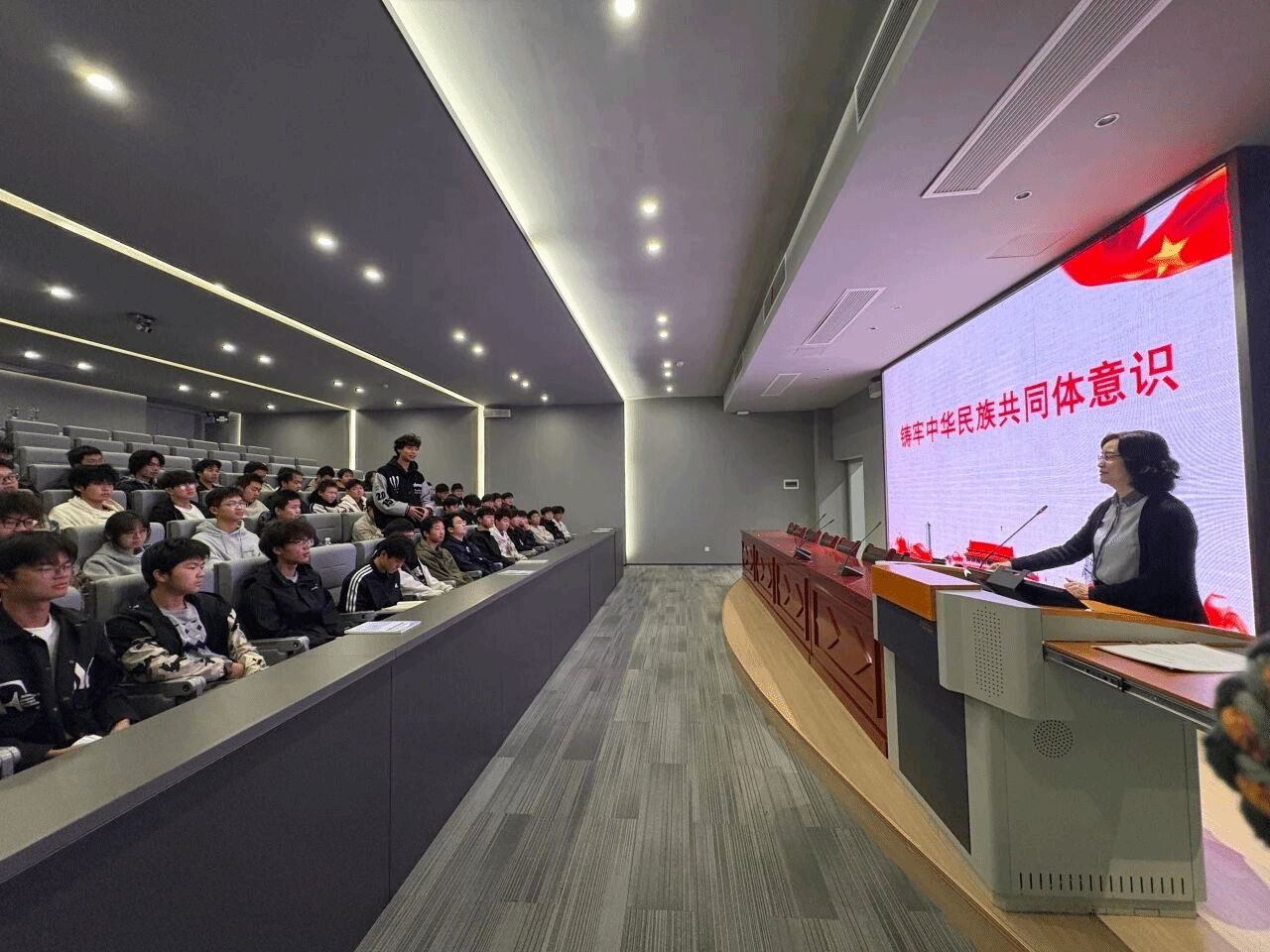 10月29日上午,学术楼3号报告厅,校长刘佳霓以《铸牢中华民族共同体意识》为题,为电子工程学院2025级学生讲授“形势与政策”课。