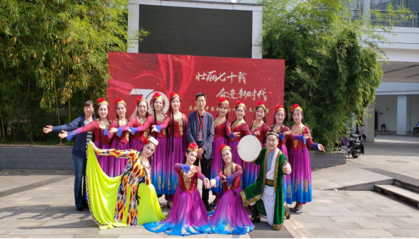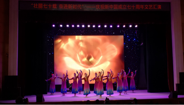 我校离退休老同志参演的节目是新疆舞蹈《欢乐的麦西来甫》。这一节目曾代表学校参加了武汉市委老干部局在武汉剧院举行的全市离退休干部庆祝新中国成立70周年文艺汇演。当欢快且充满激情的新疆舞音乐响起,离退休老同志们怀着喜悦的心情,用优美的舞姿表达出全国各族人民对祖国70华诞的深深祝福,祝愿我们国家更加繁荣昌盛,祝愿我们的明天更加美好!离退休老同志的精湛的表演也赢得了广大观众的阵阵掌声。