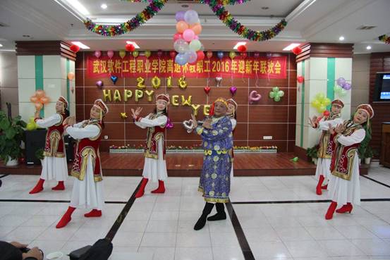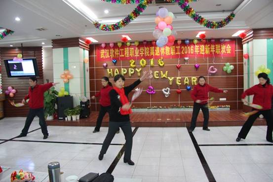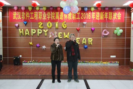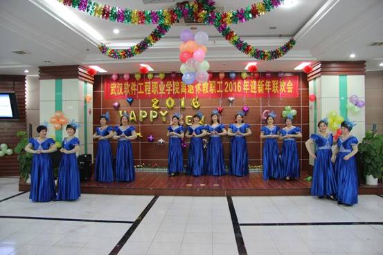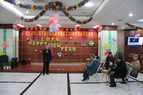 2015年12月29日上午,虽然天气寒冷,但武汉软件工程职业学院汉口校区2楼多功能厅里却温暖如春,洋溢着欢歌笑语,160余名离退休老同志欢聚一堂,共迎2016新年的到来。学院党委副书记郭友鹏同志,离退休党总支书记肖华初同志,院老年协会会长张道掀同志参加联欢会,联欢会由学校老年艺术团长杜喜平同志主持。