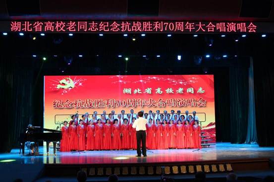 为纪念抗日战争胜利70周年,2015年7月5日,湖北省高校老干部工作研究会、省高校老年协会在中国地质大学(武汉)大礼堂隆重举行湖北省高校老同志纪念抗战暨世界反法西斯战争胜利70周年大合唱演唱会。湖北省教育厅有关领导,各高校老年协会会长及各单位离退休工作处负责同志应邀参加了此次演唱会,共有十七所高校老年合唱团参加了大合唱演出。
