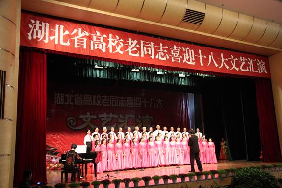 (通讯员:喻科)在中国共产党第十八次代表大会召开前夕,由湖北省高校老年协会、湖北省高校老干部工作研究会共同组织的“湖北省高校离退休老同志喜迎十八大文艺汇演”于2012年10月30日在湖北经济学院大学生活动中心隆重举行。参加这次文艺汇演全省共有18所高校,我院作为唯一一所高职高专院校非常荣幸地参加本次文艺汇演。在学院离退休工作处地精心组织和大力支持下,我院老年艺术团在文艺汇演上表演了混声合唱《去一个美丽的地方》。学院艺术团的老同志们用饱满的激情和优美动听的歌声抒发了对迎接党的十八大胜利召开的热切期盼,他们深情并貌的演唱博得了在场观看演出的省及兄弟单位领导的掌声和好评,也很好的展现了我院离退休老同志的精神风貌。演出结束后,湖北省教育厅、省高校老年协会、省老干部工作研究会为参加演出的各高校颁发纪念奖杯。
