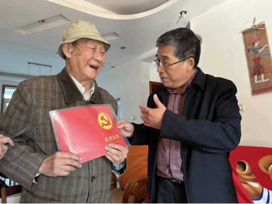 ▲副校长万国邦将中共中央组织部开具的党费收据送到吴老手中